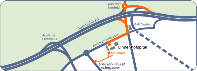 Die Praxis befindet sich im Erdgeschoss vom «Sahlihaus / Lindenhofspital». Benutzen Sie dazu den Lift im Hauptgebäude links neben dem Empfang und fahren Sie in das 2. Untergeschoss.